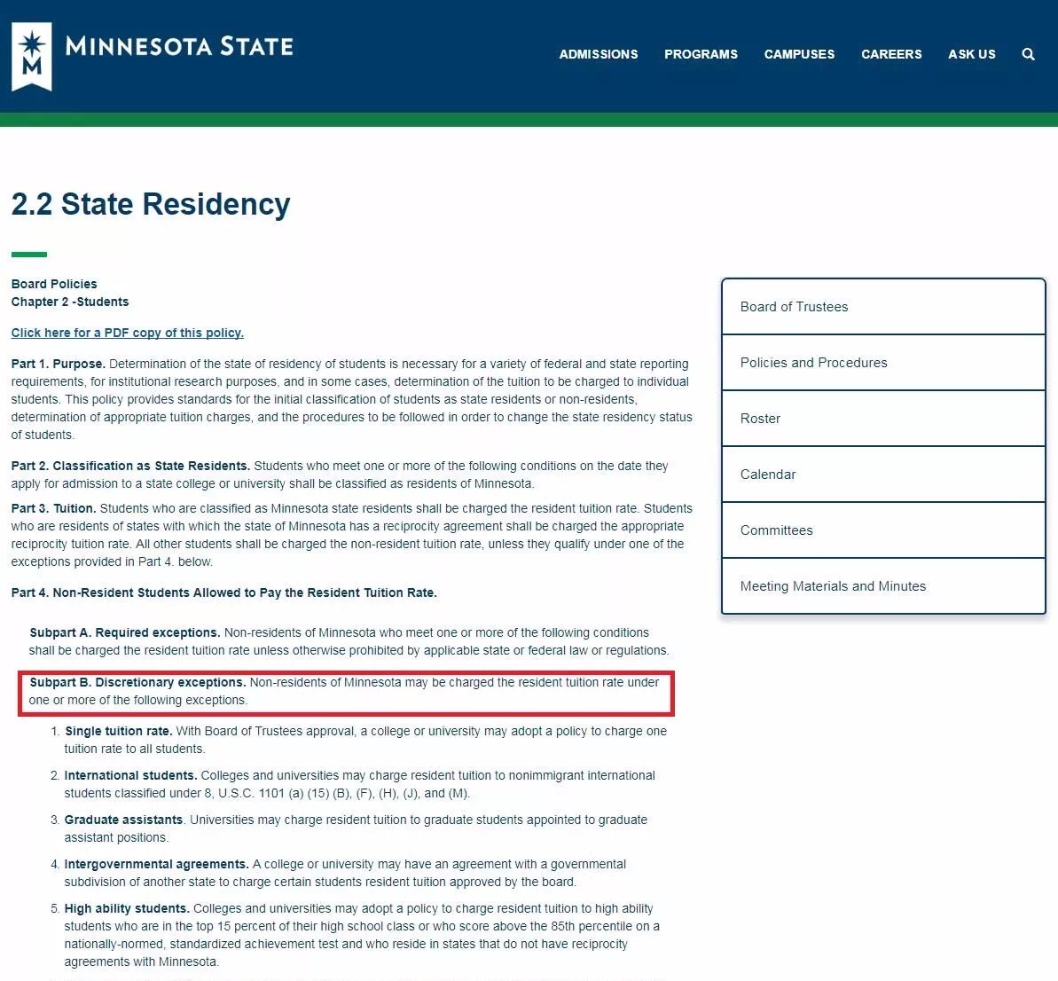 明尼苏达州州立大学系统的政策也允许酌情向国际学生收取学费,比如有些提供大学丰厚奖学金,相当于将学费降低到本州居民水平。