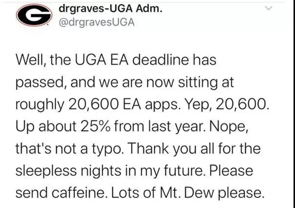 &lquo;今年EA申请阶段,佐治亚大学接到超过20,600份申请,相比去年人数暴涨25%。即将迎来无数不眠之夜。&rquo;