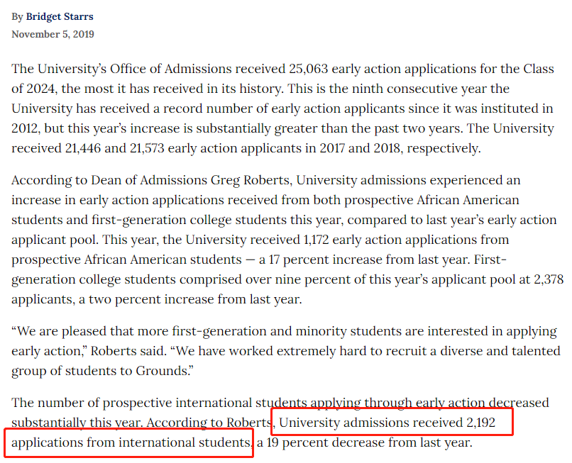 根据在官网的查询,去年弗吉尼亚大学EA申请阶段收到了2192名国际学生的申请,今年这一数字是2542,这也就是说这个申请季国际学生EA申请也同步增长了16%!!!