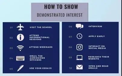1、Demonstrate Interest&mash;&mash;表现出你的兴趣!邮件联系招生官:主动联系学校,更新你的申请材料(建议时间点:高三上学期结束,随mi-year report一起更新)。千万不要滥用邮件!