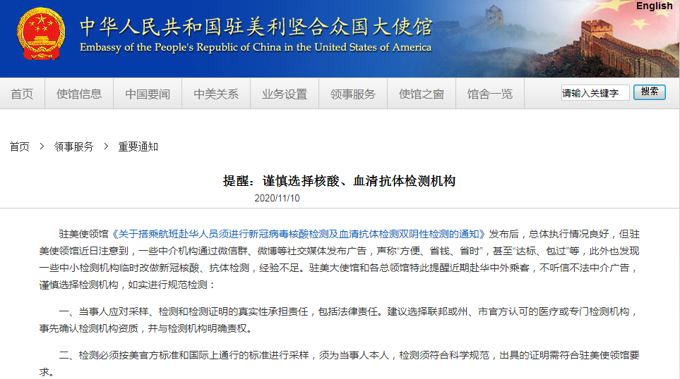 驻美大使馆和各总领馆特此提醒近期赴华中外乘客,不听信不法中介广告,谨慎选择检测机构,如实进行规范检测: