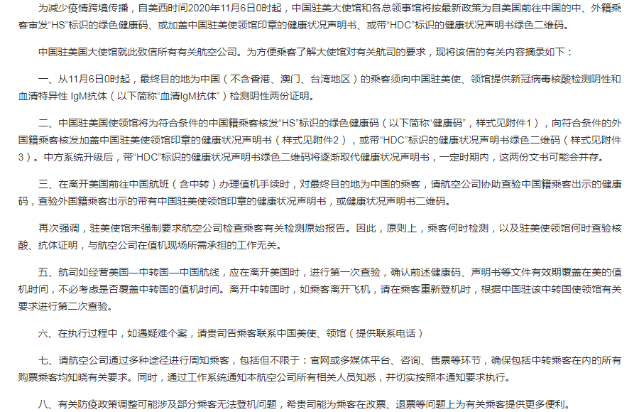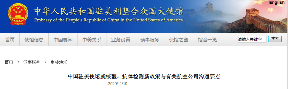 此外,中国驻美大使馆就《关于搭乘航班赴华人员须凭新冠病毒核酸检测和血清抗体检测双阴性证明登机的通知》致信所有有关航空公司。