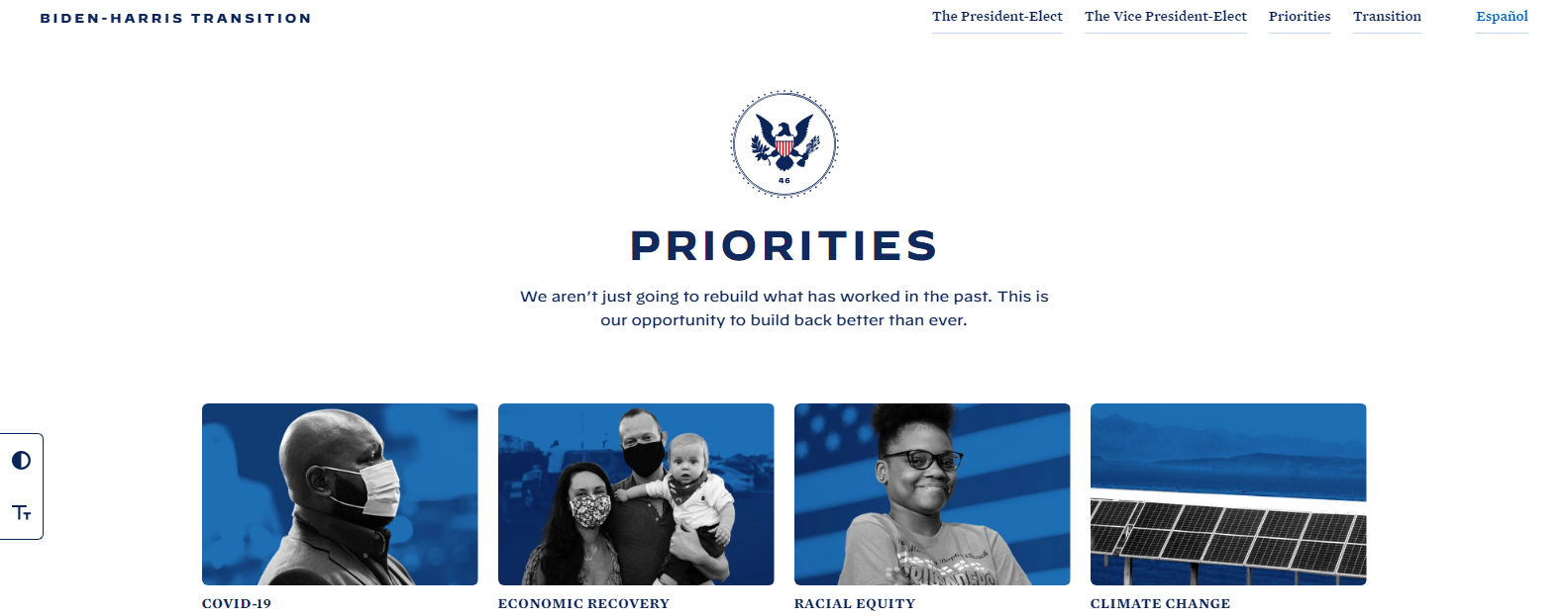 拜登团队的“过渡网站”在11月8日发布了下一任期的四大优先事项,包括应对新冠疫情、促进经济复苏、恢复种族平等以及应对气候变化,这意味着特朗普的多项议程将发生重大转向。