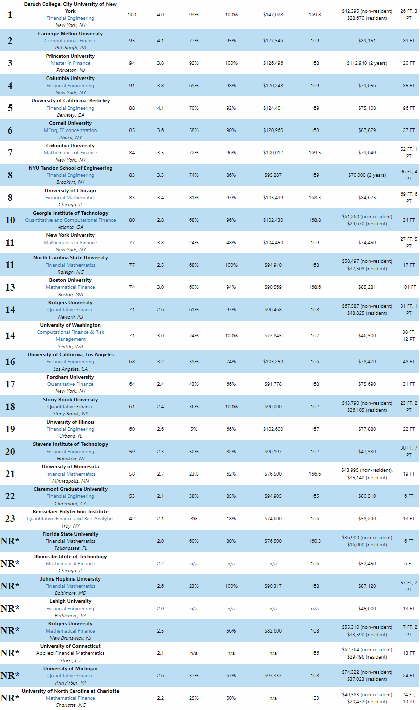 项目简介:由于无与伦比的地理位置,以及可以与本校Courant研究所的金融数学项目共享资源,近年来在Quantnet上的排名越来越高