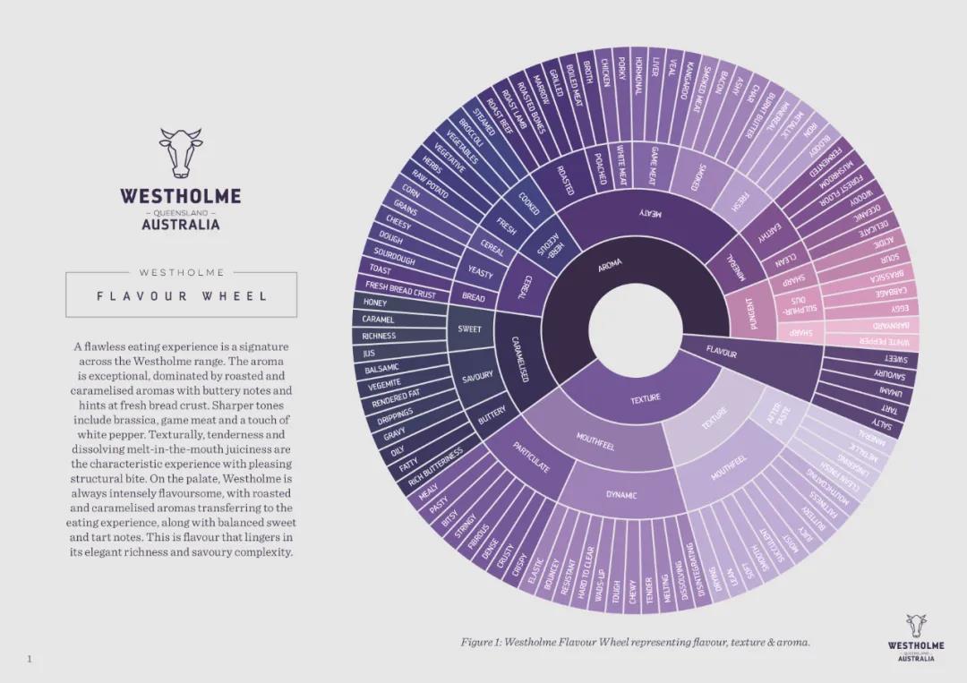 这一全新的风味轮盘由昆士兰大学的Heather Smyth博士和澳大利亚农业公司的精品和牛品牌Westholme合作研发和设计,旨在提供描述和牛产品的标准词语,并区分和牛不同部位以及雪花纹理等级。