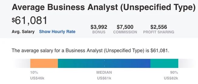 根据payscale的数据来看,商业分析员的年薪约为61,000美元(约40万人民币)。在知乎的相关话题下,一些在美国读这个专业的学生或者相关从业人员就自己的亲身经历给出的数据则更高一些,其中有人写到,初入职场的毕业生年薪可高达92,000美元。