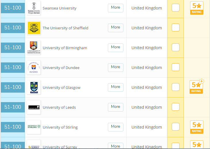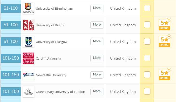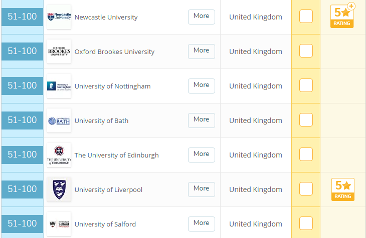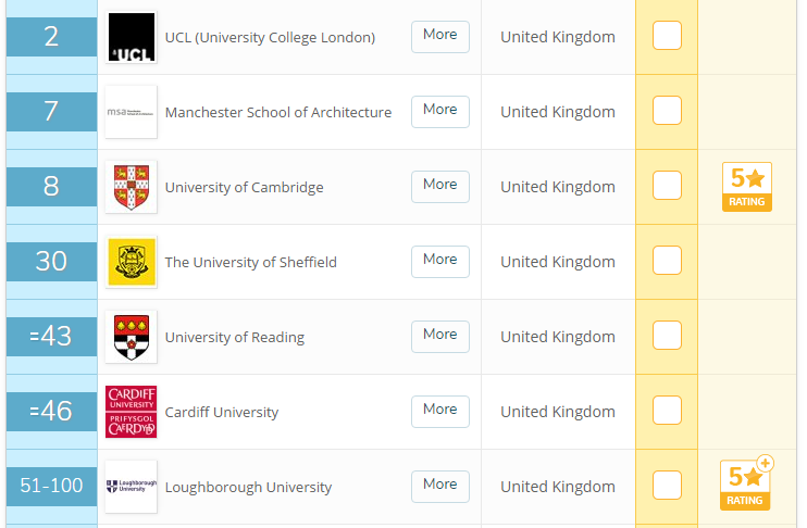 由上图可见,排名英国前 50 的有六所学校,分别是伦敦大学学院、曼彻斯特建筑学院、剑桥大学、谢菲尔德大学、雷丁大学、卡迪夫大学,排在全球前 100 的一共 14 所。