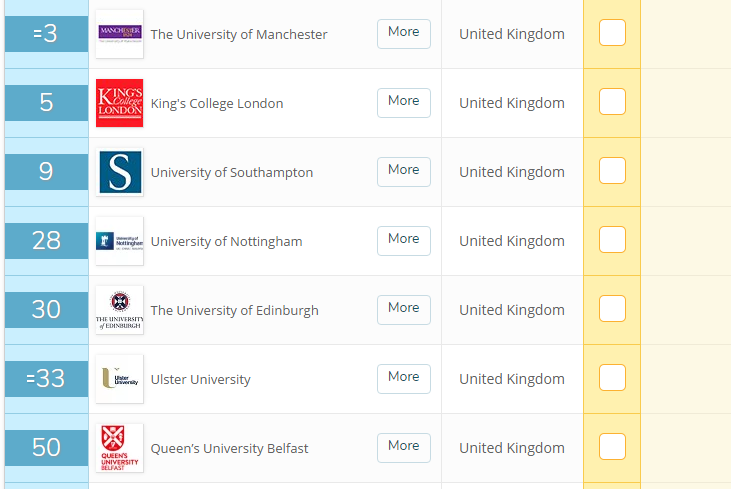 护理方向的专业英国优势非常明显,排在前 100 的学校众多,前 50 有 7 所,前 100 有 15 所。其中前 50 的有曼彻斯特大学、伦敦大学国王学院、南安普顿大学、诺丁汉大学、爱丁堡大学、阿尔斯特大学、英国女王大学。