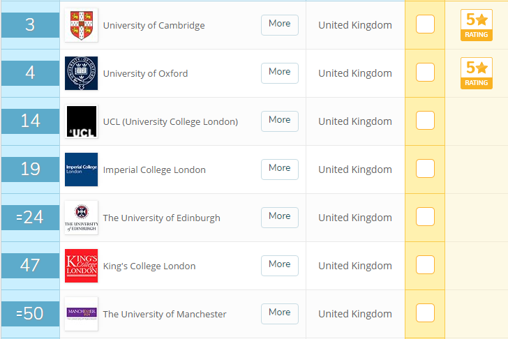 生物科学相关专业英国前 50 的学校有 7 所学校,前 100 的学校有 10 所,其中,前 50 的学校有剑桥大学、牛津大学、伦敦大学学院、帝国理工学院、爱丁堡大学、伦敦国王学院、曼彻斯特大学。