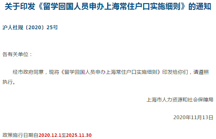 本实施细则自2020年12月1日起施行,有效期至2025年11月30日。本实施细则中未尽事宜,由上海市人力资源和社会保障局会同相关部门负责解释。原《留学回国人员申办上海常住户口实施细则》(沪人社外发〔2015〕49号)同时废止。
