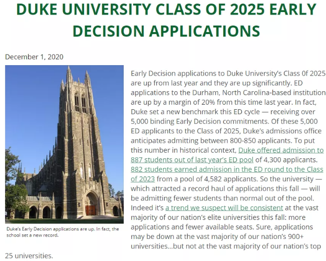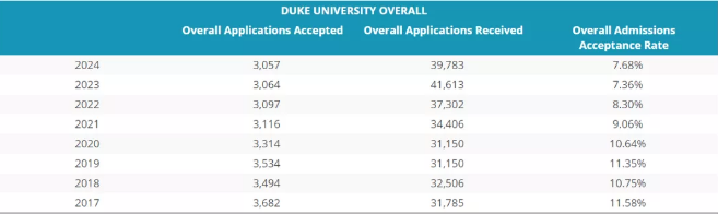 对此,杜克大学认为这是一个趋势,且美国的绝大多数精英大学今年的录取情况都将如此:申请总人数增加,但最终录取数量减少。