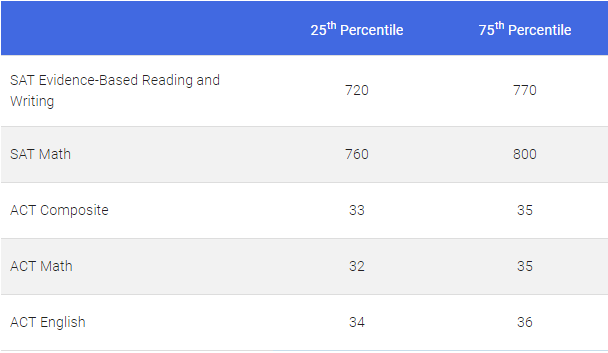 这些提交分数的学生中,SAT 阅读和写作部分25%-75%分数为:720-770。SAT数学部分为760-800。ACT 25%-75%的分数为33-35。