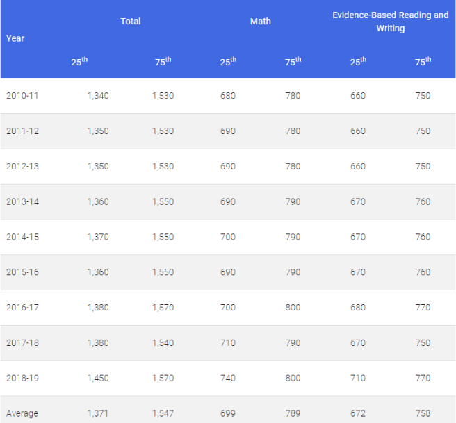 在官网中也可以看到,2023届录取学生的SAT中值区在1500-1560,录取学生的平均水准已经相当高了。但前几年的数据并没有这么高,整体录取学生的平均分数线还是较低的。直到2018年,分数才突然提升。