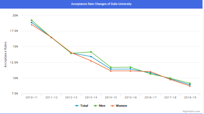有数据统计,在2010-2019这十年期间,杜克的平均本科录取率为12.8%。近几年的录取率大幅下降,除了录取标准不断拔高之外,也跟赴美留学人数的增多有很大的关系。