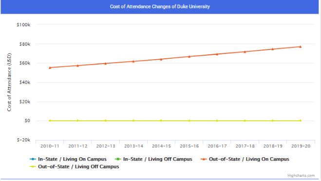 按照collegetuitioncompare的数据显示,与2010年(55,150美元)相比 ,包括学费,杂费,书本和用品成本以及生活费用在内,十年间,杜克的总成本增加了39.67%。
