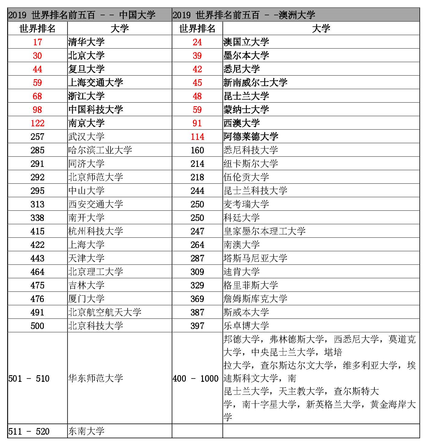 澳大利亚VS中国大学排名