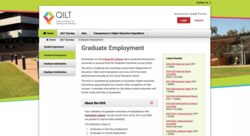 QILT (Quality Inicators for Learning an Teaching) 是由澳大利亚政府的教育技能和就业部支持建立的网站,公开提供经政府认同的高等教育调查数据,主要包括了本科学生和硕士学生毕业后的就业数据,以及学生学习经历整体满意度。数据参数全澳国家认可。