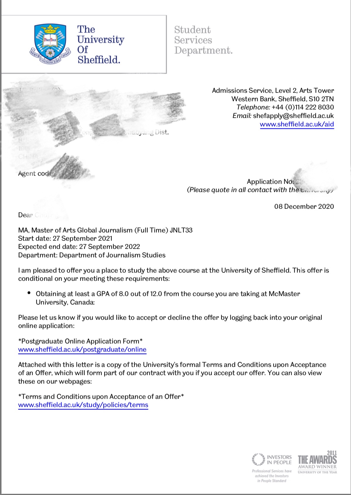 贺同学希望学习新闻相关的专业,不再学习戏剧电影类的传媒类专业方向,我帮贺同学推荐了可以接受学生院校背景及专业背景申请且世界综合排名和专业排名都比较高的英国谢菲尔德大学的全球新闻学专业。英国谢菲尔德大学新闻学院全英第一,新闻类专业更是近年来比较热门的专业方向,学校雅思要求是6.5分。学生有加拿大的高中和本科学习经历,综合学生绩点和各方面语言基础,综合筛选出这所学校也比较适合学生去争取一下。谢菲作为学生的冲刺院校方案,申请过程中,最大的申请难点莫过于学生的专业成绩不符合谢菲尔德大学全球新闻专业申请的最低要求,我根据往年此专业申请经验并结合官网标准入学要求,我明白如果绩点差距比较大,但如果有相关的实践经历是非常重要的,我和学生进行详细沟通,强调在文书制作中突出她的的两段省台经历,且可以在毕业之前达到学校要求的8/12的成绩,突出学生对本专业领域浓厚的兴趣。这些都证明了贺同学有能力完成英国大学的课程,且是一个出色的申请候选人。在申请过程中平稳把握学生亮点,规避风险,最终成功帮学生免雅思跨专业拿到了英国百强名校英国谢菲尔德大学全球新闻学专业的录取offer!Offer展示: