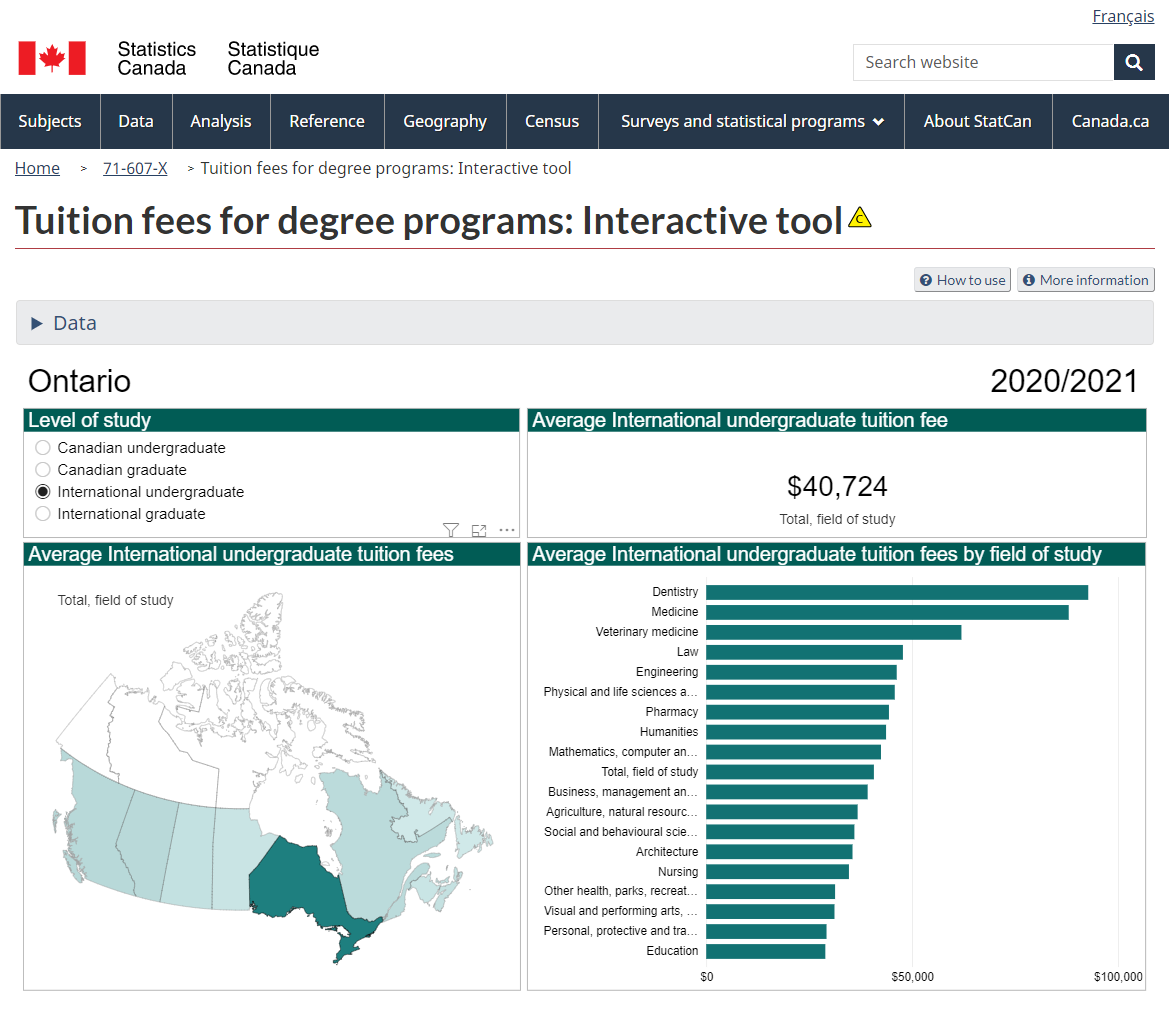 由于安省的学费高于全国平均水平,所以在安省学习各个专业的支出也较高,比如最贵的专业为牙医,平均学费超出$9万加元。