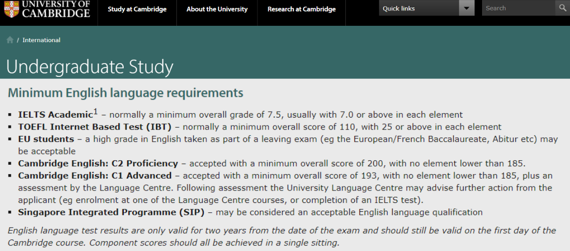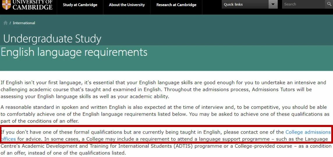剑桥大学在领域拥有崇高的学术地位及广泛的影响力,被公认为当今世界最顶尖的高等教育机构之一。剑桥大学本科接受以下多种语言成绩证明,雅思要求7.5(7.0)对于国际生通常都要求递交语言成绩,但如果高中是英语授课,可以联系学院寻求帮助(或可免递交语言成绩)