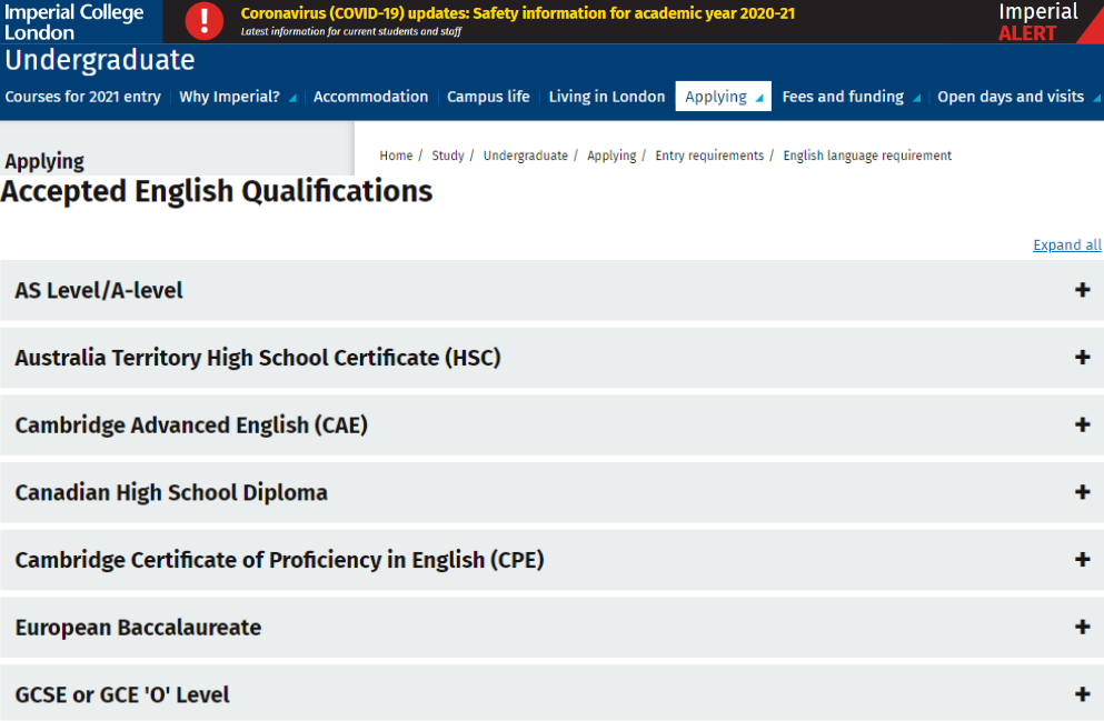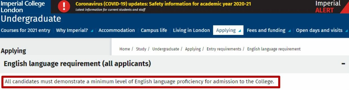 任何申请本科的同学都必须递交语言成绩,或递交证明自己语言达标的考试分数。帝国理工也接受包括A-level、IB、GCSE在内的多种成绩证明