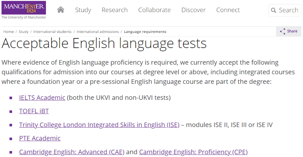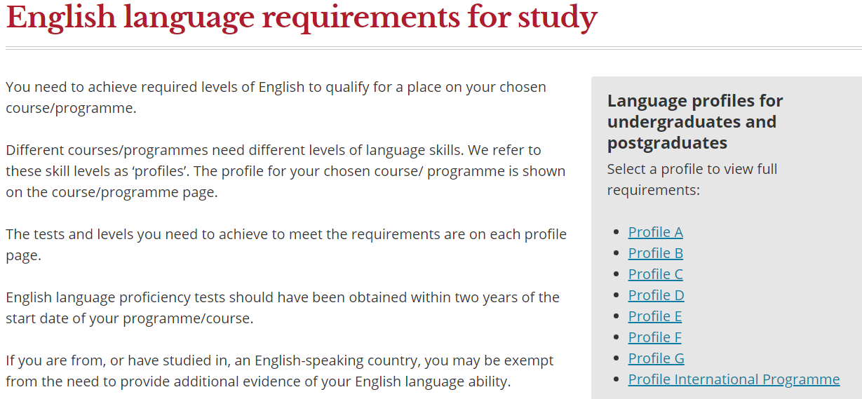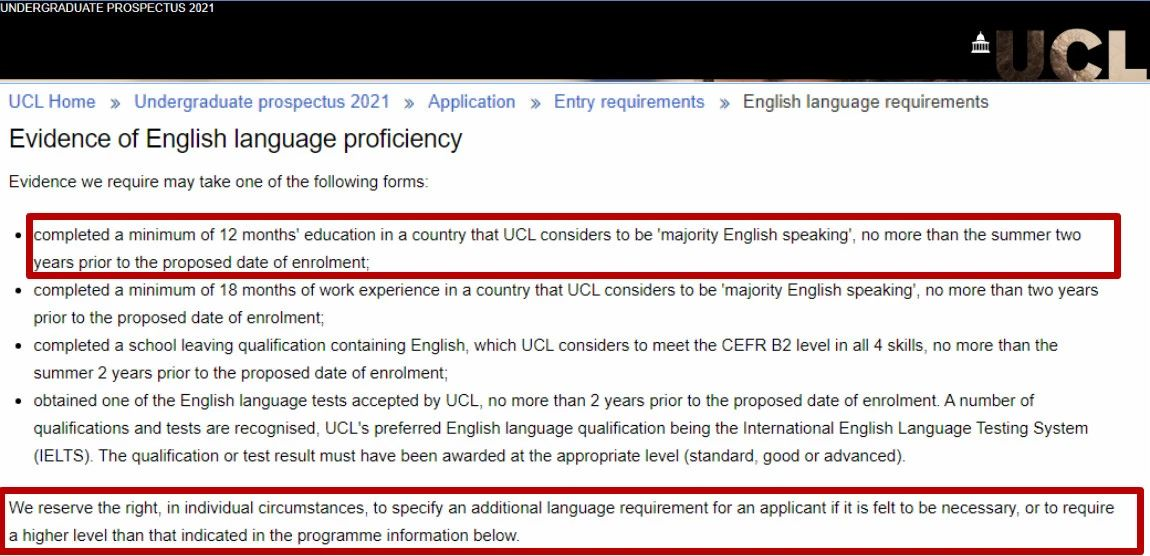 UCL同样接受包括IB在内的多种成绩来证明语言合格,但如果是在UCL认可的“英语语言国家”学习超过(包括)12个月,那么就会视为满足语言标准!