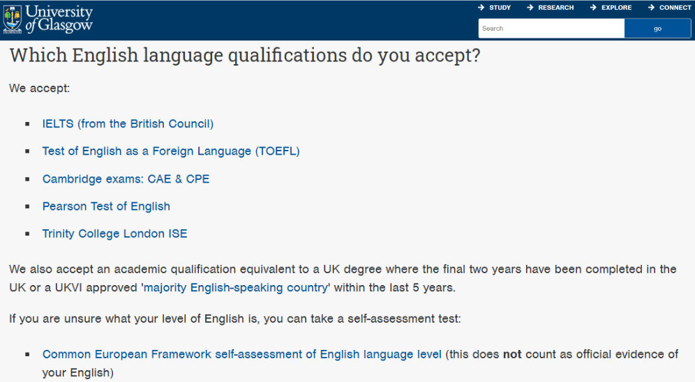 格拉斯哥大学官网并未给出统一的本科语言要求,需以专业为准具体查询,接受以下语言考试成绩