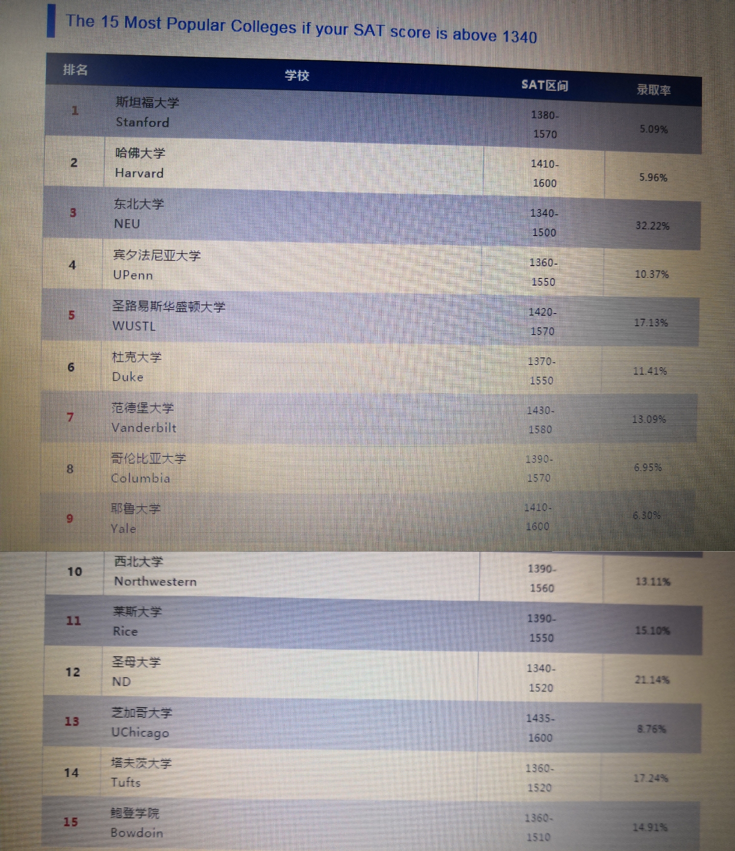 不同SAT成绩的高中生都希望去到哪所美国大学?根据数据统计,我给大家整理出了不同SAT成绩区间段的学生最喜爱的各15所美国大学:最受SAT成绩高于1340分的学生欢迎的15所大学;最受SAT成绩在1200分到1340分之间的学生欢迎的15所大学;最受SAT成绩在1030分到1200分之间的学生欢迎的15所大学