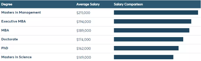 麻省理工学院收入最高的学位是管理学硕士,校友的平均薪资为211,000美元。其中,年薪最低的是其他硕士学位,平均年薪为11万美元。