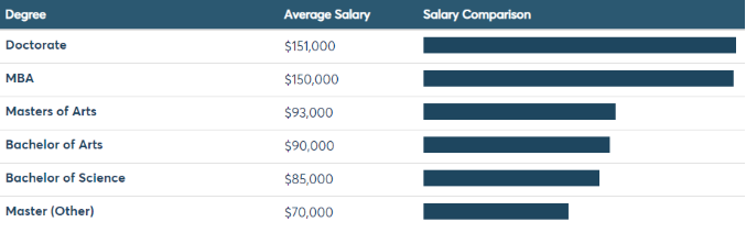 哥伦比亚大学收入最高的学位是博士学位,校友的平均工资为203,000美元。其中薪水最低的是文学硕士学位,平均年薪约为92,000美元。