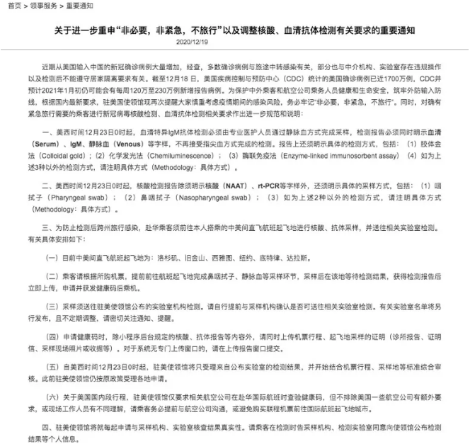根据通知,美西时间12月23日0时起,血清特异IgM抗体检测必须由专业医护人员通过静脉血方式完成采样,检测报告必须同时明示血清(Serum)、IgM、静脉血(Venous)等字样,不再接受指尖血方式完成的检测。报告上还须明示具体的检测方式,包括: