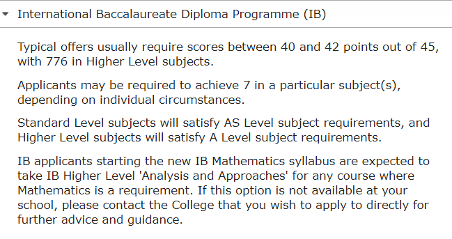 剑桥大学通常要求IB分数不低于40-42(满分45),其中三门HL科目的成绩不低于7 7 6;学校可能要求申请者的某些科目成绩为7,具体根据不同专业不同学院的情况而定。SL科目将会满足AS科目要求,而HL科目将会满足A-Level科目的要求。