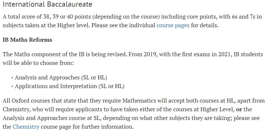 牛津大学要求IB分数不低于38,39或40,HL科目分数为6或7(根据不同专业不同学院的情况而定)。