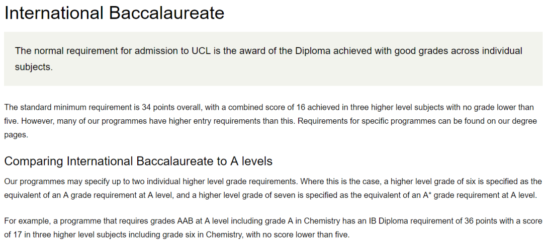 UCL对IB成绩的最低要求为:总分不低于34,3门HL科目总分不低于16且单科成绩不低于5。很多专业的入学要求高于这个标准,申请者可通过官网查询具体专业的相关要求。UCL每个专业的具体IB成绩要求可以通过学校官网查询。