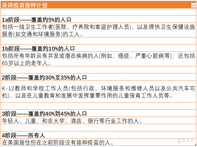 根据美国疾病控制与预防中心(CDC)的接种计划,美国疫苗接种计划分为:1a,1b,2和3阶段。