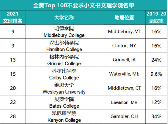 名单中,综合类强校和全美Top 10文理学院赫然在列。因不需要提交小文书,申请起来相对更省心!值得划入选校清单!