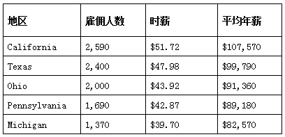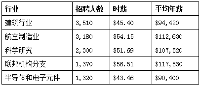 主要产业分布在飞机生产,建筑与工程,科研开发与半导体等产业。材料工程师需要使用CAD软件办公,少数情况也需要前往工工厂或者施工现场处理相关工作。以下是材料工程师在美国的行业招聘及待遇情况(来源自美国劳工部2018年5月数据):