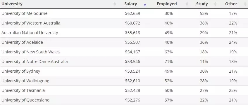 **排名第二的是 西澳大学 ,平均薪资60672澳币,它和墨尔本大学也是仅有的两所薪资超过6万的大学。有意思的是西澳大学毕业生就业率和阿德莱德大学同样并列前十的倒数第二…仅有40%。 **
