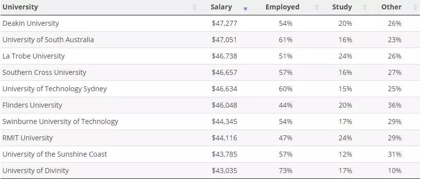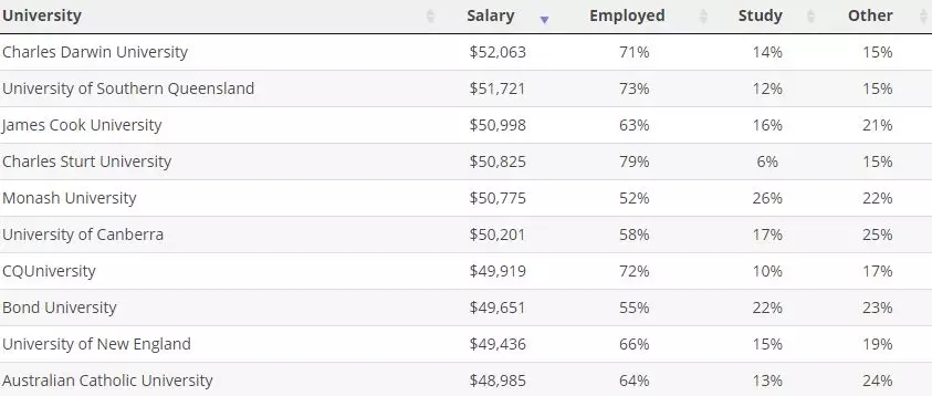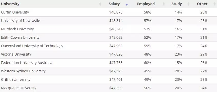 **澳洲八大基本都进入了前十的榜单,那么 非澳洲八大的学校 毕业生薪资待遇如何呢?下面给大家送上完整的榜单:**