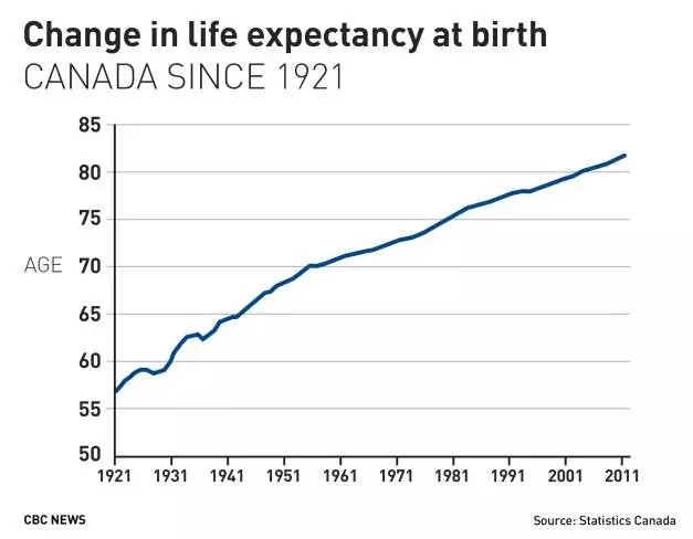 研究表明,到 2030 年加拿大人的平均寿命将比现今有明显增长,女性达到 87 岁,男性达到 84 岁; 2010 年出生的女性预期寿命是 83.94 岁,男性是 79.41 岁。