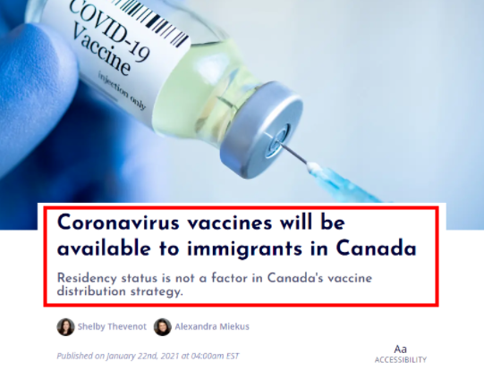 根据CIC News消息,加拿大公共卫生局证实,“COVID-19疫苗将提供给所有被批准并建议使用的每一个人,这适用于所有加拿大的居民,无论他们是否拥有公民身份。”