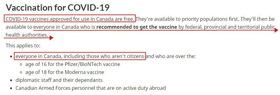 与此同时,加拿大政府官网也明确指出,获准在加拿大接种新冠疫苗是免费的。