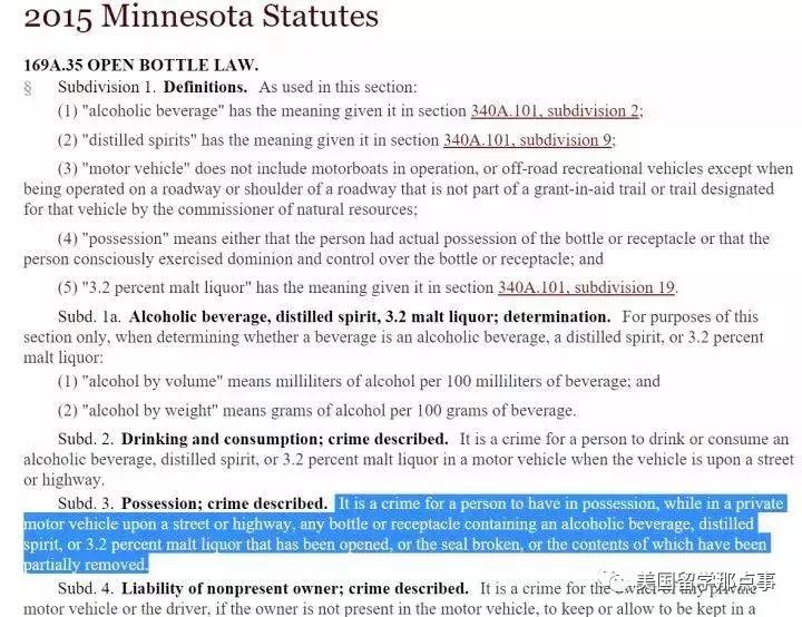 明尼苏达州的法律,也就是大明律,169A.35 Sub 3. 条规定到:在位于街道上的机动车上持有打开瓶盖的酒精饮料,属于犯罪行为。