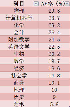 IGCSE热门科目A率 科学、计算机、加数等理科科目A*率普遍高于人文类科目,这主要是由于人文社科类科目主观性较强,影响因素太多,答案不唯一,因而拿高分也并不容易。