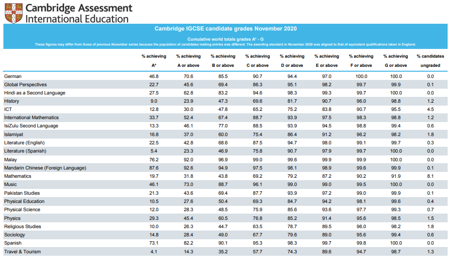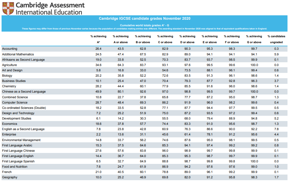 PS: 下图为CIE考试局IGCSE各科的成绩数据分析 第一列是各科科目名称 成绩从A到G以累计形式给出 %代表累计的百分比
