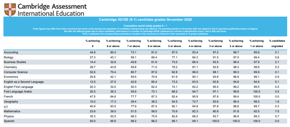 PS: 下图为CIE考试局IGCSE各科的成绩数据分析 第一列是各科科目名称 成绩从9到1以累计形式给出 %代表累计的百分比