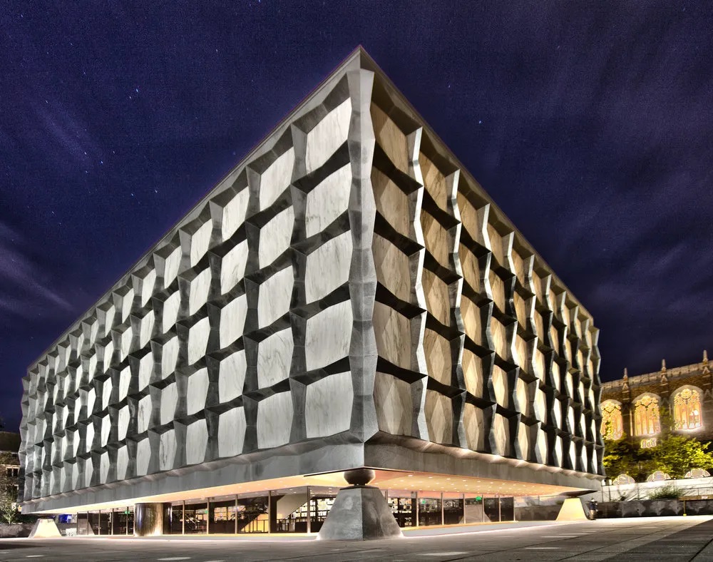 Beinecke Rare Book an Manuscript Library是1963年拜内克家族捐赠给耶鲁的礼物,是世界上最大的专为保存珍贵书籍和手稿的建筑。 2015年图书馆进行过翻修,图书馆由一片片巨大的花岗岩大理石砌成,外观看起来像是一个有着灰白相间格子的大盒子,内部则因为光线的照射,让大理石闪闪发亮,别具一格。 馆内收藏第一本 Gutenberg Bible。