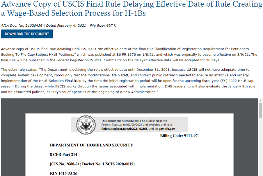 USCIS在延迟生效日期的文件中提到, “为了给移民局更多时间来完成系统开发、测试和实施对H-1B注册系统和筛选流程的修改, 国土安全部将最终规则的生效日期从2021年3月9日推迟到2021年12月31日。
