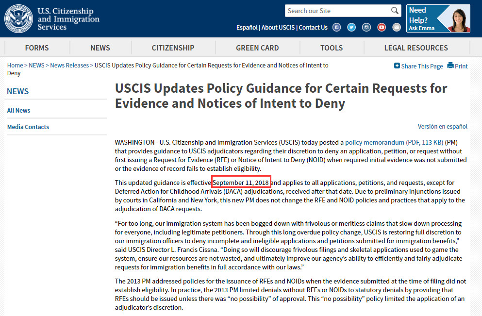 但是 2018 年 9 月 11 日起 ,美国移民局收到的所有移民 / 非移民申请,以及身份转换请求,如果申请人一开始提供的材料不符合要求,或者没有提交完整的证明文件,移民官不再事先发补充材料( RFE )或否决意向( NOID )通知书而 直接拒绝这份申请。
