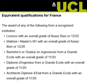 硕士学位:14/20(Maitrise / Master's M1 with an overall grae of Bien or 14/20);